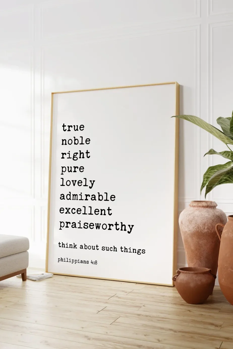 “Whatsoever things are true, whatsoever things are honest, whatsoever things are just, whatsoever things are pure, whatsoever things are lovely, whatsoever things are of good report; if there be any virtue, and if there be any praise, think on these things.” - Phlippians 4:8